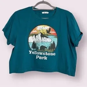Love & Lazy Days Teal Blue Yellowstone Park Graphic Cropped TShirt. Teal blue/green color. Intentionally distressed Yellowstone Park graphic. Cropped tshirt. Size Large.