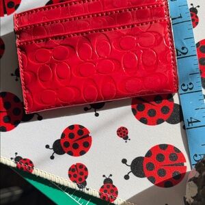 Sleek and stylish red croc-embossed patent-leather card holder.
