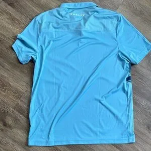 Stylish Oakley polo with dynamic blue patterns. Comfortable and versatile for any occasion.