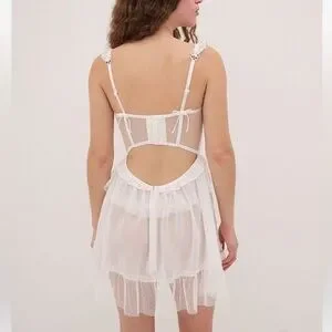 Unlined Underwire Tiered chiffon and mesh skirt Satin-covered front buttons Adjustable ruffle-front straps Back hook-and-eye closure Bow details Hits at mid thigh Partially made with recycled materials Hand wash, lay flat to dry Imported