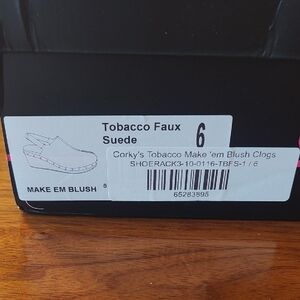 Chic brown suede clogs with a wooden sole. Features a slingback strap and metal stud accents. Corky's. Used pre-owned condition. 2 1/2" heel.