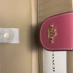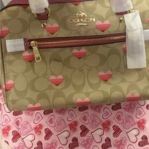 Elegant Coach satchel with heart print. Tan and pink design. Perfect for any occasion. The wallet also comes with the bag