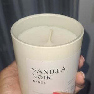 Vanilla Noir scented candle with notes of myrrh, saffron, and oakmoss. Poured in CA, small batch.