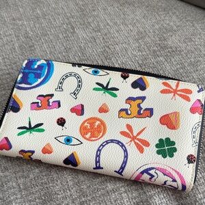 Vibrant wallet with playful prints. Features iconic logo. Zipper closure.