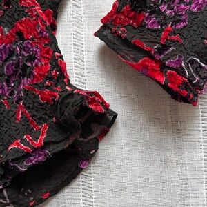 A stylish, semi-sheer blouse with a luxurious texture, known for its elegant drape and versatile design. Delicate ruffled detail. It features a prominent, multicolor floral design created using a velvet burnout technique, which leaves the patterned areas with a rich, soft pile and the background semi-sheer.