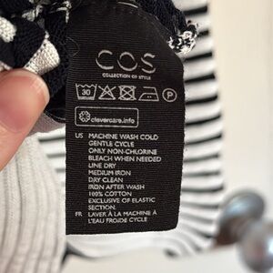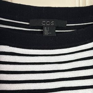 Elevate your wardrobe with this COS navy and white striped top, crafted from 100% cotton for a breathable, high-quality feel. Features a classic boat neck, 3/4 length sleeves, and a modern Breton-inspired stripe pattern. The fabric has a comfortable natural stretch and hangs beautifully, making it perfect for both casual outings and effortless everyday style.