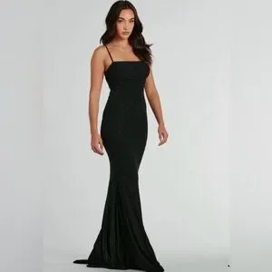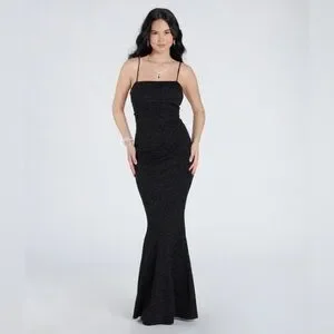 Chic black maxi dress with shimmering details. Perfect for evening events. Sleek and stylish design.