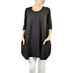 Round neckline, 3/4 sleeves, pockets at front hip. Lantern silhouette
