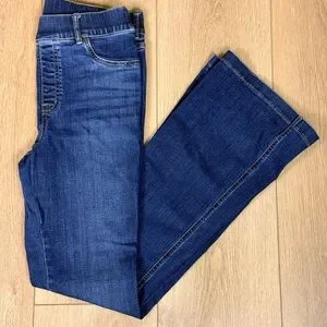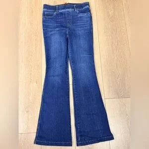 Spanx pull-on flare jeans in excellent preowned condition. Comfortable smoothing stretch with a flattering pull-on waistband and classic light wash. Easy, polished denim look with all-day comfort.