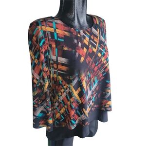Elevate your style with this vibrant multicolor geometric abstract pattern top. Perfect for any occasion, this top features a unique design that stands out.