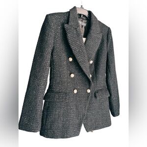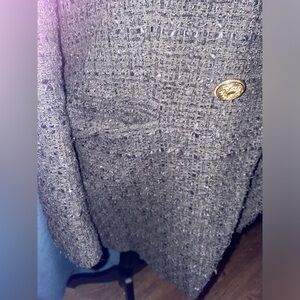Chic charcoal blazer. Features metallic buttons. Ideal for sophisticated looks. Has some flaws.