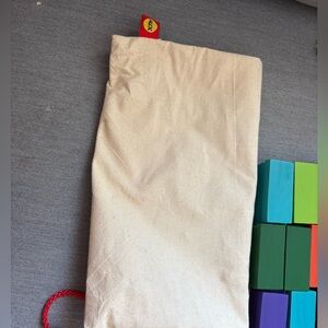 Set of colorful wooden retro-style blocks. Contains some rectangular pieces as well as others as shown in photos. Has an 80’s feel to them although they are all in really good condition. Comes with handy canvas storage bag.