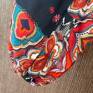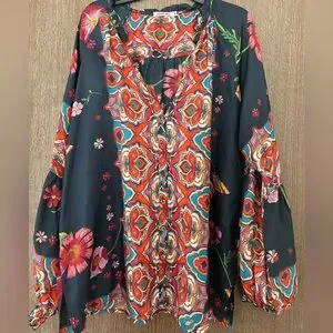 Vibrant blouse with intricate floral design. Features bold patterns and rich colors. Perfect for a bohemian look.