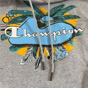 Champion hoodie in gray with a bold leafy design. Casual and trendy.