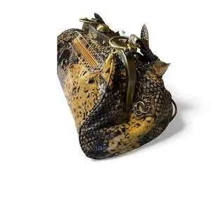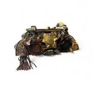 Crafted in a snake-embossed leather with warm earth tones, this sculptural frame bag features intricate three-dimensional floral appliqués, a dramatic tassel accent, and signature ornate metalwork. Every angle reveals thoughtful detail, from the engraved handle to the framed kiss-lock closure.