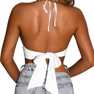 Elevate your style with this chic white halter neck top featuring a trendy ring detail. Perfect for any occasion.
