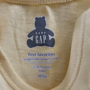 2 comfortable baby bodysuit and pant sets by GAP. Made from organically grown cotton. Ideal for 3-6 months. Yellow floral print and soft yellow solid. Ruffle detail at shoulders.