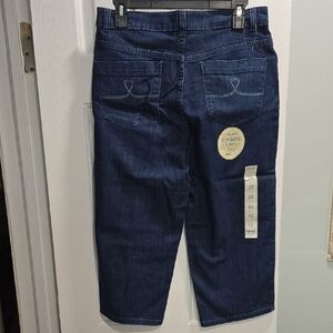 Dark wash denim capris, perfect for any casual occasion. Durable and stylish. Slimming tummy panel. NWOT. Never worn. Button and zipper closure. Front and back pockets. Belt loops. Laid out flat the waistband is about 16in. Inseam is about 20in. Color may vary as pictures were taken with and without flash. Please review all pictures and let me know if you have any questions.