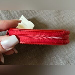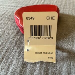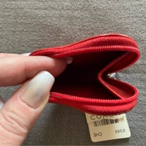 Super cute small Coach red leather heart-shaped coin purse. Original tag attached. Measures about 3” x 3.5” x 5/8”. Zips closed.