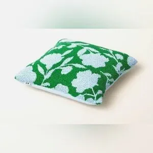 Decorative throw pillow with a green and blue floral design. Perfect for adding a touch of color to any room.