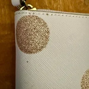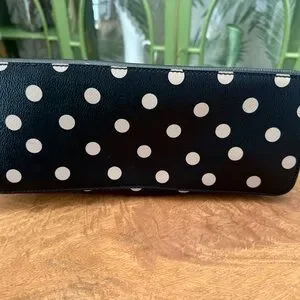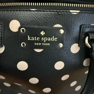 Stylish and chic, this Kate Spade handbag and wallet set features a black bag with playful pinky taupe polka dots. Perfect for adding a touch of elegance to any outfit.