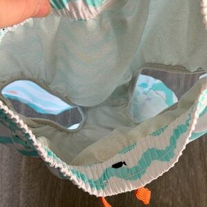 Turquoise shorts with wave design. Features multicolor fish accents. Elastic waistband with bright orange drawstring.