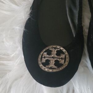 Elegant velvet flats with iconic logo accent. Ideal for sophisticated style.