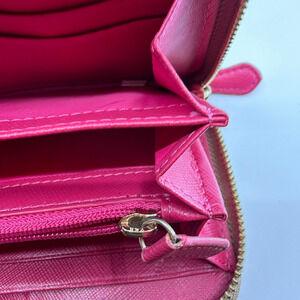 Discover functional elegance with this authentic Coach Accordion Zip Wallet, a perfect blend of classic design and vibrant style. Crafted from Coach's iconic Signature C coated canvas in a rich brown, this wallet is beautifully accented with eye-catching hot pink pebbled leather trim, creating a striking contrast. The polished gold-tone hardware, including the prominent Coach logo and corner studs, adds a touch of sophistication. A secure full zip-around closure opens to a meticulously organized interior, featuring multiple card slots, full-length bill compartments, and a central zippered coin pocket. The interior, lined in matching pink saffiano leather, ensures all your essentials are kept tidy and accessible. This stylish accessory offers ample space for cards, cash, and coins while maintaining a sleek, practical profile. Ideal for adding a pop of color and luxury to your everyday car