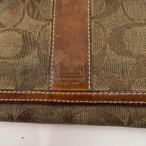 Discover timeless style with this authentic Coach Signature C Slim Flap Wallet. Crafted from durable brown and khaki Signature C jacquard canvas, this classic accessory features rich natural leather trim and interior. The wallet opens to reveal a well-organized interior with multiple card slots, full-length bill compartments, and a zippered coin pocket, all secured by a snap button closure. Despite its vintage charm, the natural leather has developed a significant patina, with visible darkening, water marks, and minor scratches, adding character to its history. The canvas exterior remains in good condition with general wear. This functional and iconic Coach wallet is perfect for everyday use, offering both practicality and a touch of heritage luxury.Key FeaturesSnap button closureMultiple card slotsFull-length bill compartmentsInterior zippered coin pocketHighlightsIconic Coach Signature
