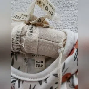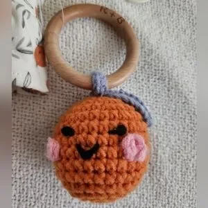Adorable baby romper featuring a playful orange print. Includes an adorable crochet orange rattle. Makes a very charming gift!