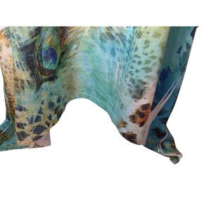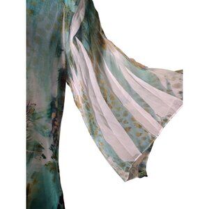 This is a very pretty knit vintage top with colorful Peacock designs with small gold studs in the front. The sleeves are pleated Chiffon bell sleeves and a shark item hem. Shoulder to shoulder measures 15" x pit to pit measures 21" x shoulder to hem measures 38" x sleeve length measures 19".