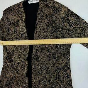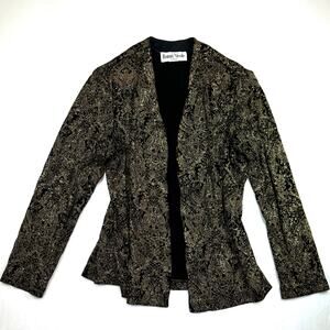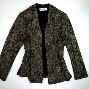 Vintage 90s Ronni Nicole by Ouida Cardigan Jacket Blazer Black Gold Glitter Sparkle Shimmer Metallic Open Front Disco Glam Party Cocktail Evening Wear Holiday Special Occasion Retro Stretch Acetate Blend Witchy Festival Boho Shoulder Pads Made in USA