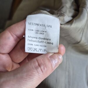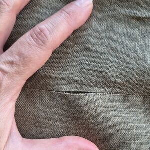 This suit needs a small seam repair, see picture. I have not dry cleaned this item, it has a few stains some look like water stains, please see video. Overall a beautiful Linen suit.