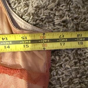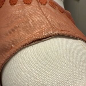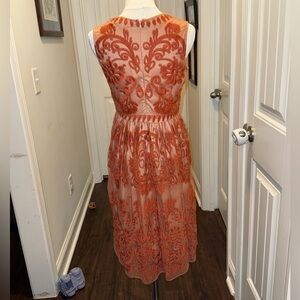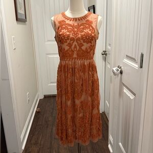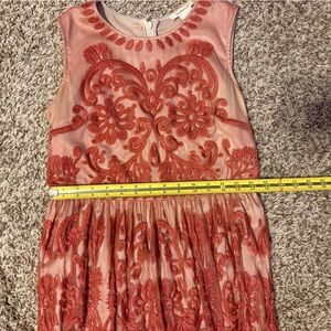 Charming rust colored dress with floral embroidered overlay. Nude liner. Sleeveless and elegant design. Back zipper closure. Right shoulder hem has one spot where thread has come out but it is not noticeable unless looking for it. There are also a couple of threads picked (see last photo) but nearly impossible to find bc of how intricate the embroidery is. Overall, this dress is absolutely stunning and still in very good used condition. Measurements in photos.