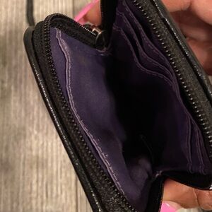 Coach leather wallet in used condition Shows some wear and distress on leather and hardware ( 7.5 x4 inches ) Black and white CC logo wristlet has some wear and cracking on strap as shown ( 8.5 x4.5 inches) Black and gray Coach wristlet has some residue on the interior lining (6.5 x 4.5 inches) Kate Spade zip round wallet in good condition Light wear on the colour in the corners (7.75 x 3.75 inches) Black Coach Poppy pouch in good condition (3.25 x 5. 5 inches) All are still in usable condition Comes with a Coach dust bag