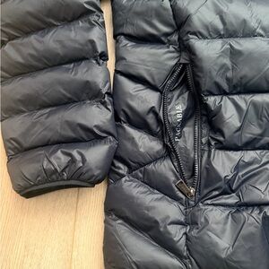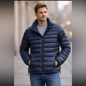 Classic Navy blue puffer jacket. Features a sleek design. Ideal for warmth and style.