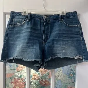 Trendy denim shorts with frayed edges. Distressed details for a modern look. Perfect for casual outings.