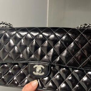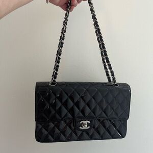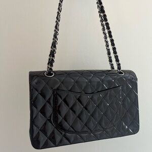CHANEL Medium Classic Double Flap Patent Black SHW
