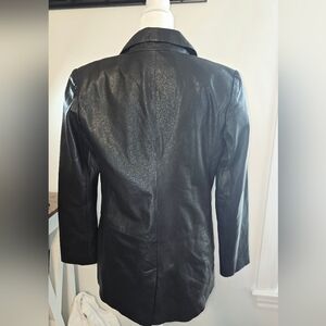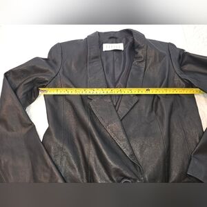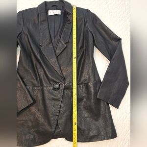 Jodi Arnold Black Lesther Blazer Women's Size 4. One button closure. Fully Lined. On the shoulder there is a small blemishes. Picture shows the shoulder. 100% Genuine Lamb Leather. Tags detail the garment. Measurements of the blazer are also shown in the pictures. Pre-owned; however, the blazer has been well-cared for, as shown in pictures. Smoke-free and pet-free home.