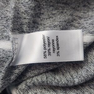 Stylish gray cowl neck sweater with white stripes. Features button details on the shoulder. Perfect for a cozy look.