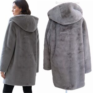 NWT Elie Tahari Grey Faux Fur Hooded Coat Cozy Chic Winter Jacket Size Medium
