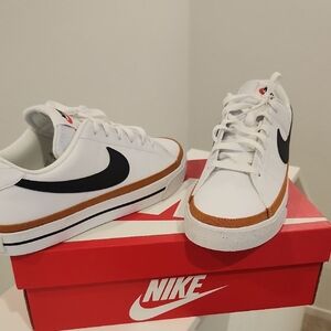 Elevate your look with these Nike sneakers. Crisp white with tan and black details. Ideal for casual outings.