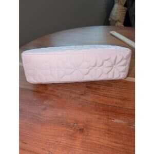 Elegant Kate Spade crossbody bag in a soft light pink leather with a quilted floral pattern. Features a silver-tone chain strap and an additional adjustable leather strap for versatile wear. Compact and stylish, perfect for everyday use or special occasions.