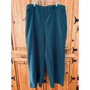 Teal blue polyester, rayon and spandex. 2 front pockets. Waist measure is 42 inches. Rise is 15 inches. Inseam is 31.5 inches.