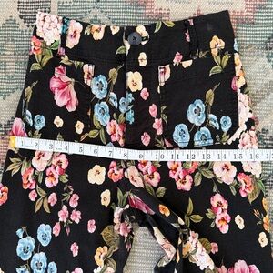 Stylish wide-leg pants with a vibrant floral pattern. Features pink, blue, and yellow flowers on a black background.