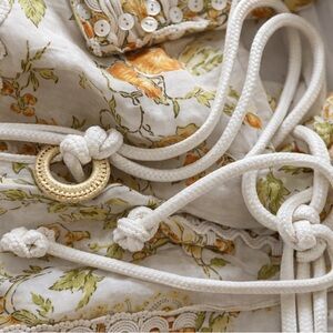 Elegant ALÉMAIS floral dress crafted in a lightweight, airy fabric with a soft cream base and warm orange-green floral print. Features a ruffled high neckline, delicate lace trim, pleated bodice, and pearlescent button detailing throughout. The silhouette is finished with an adjustable rope belt with woven ring detail for a flattering, cinched fit.
