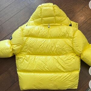 Bright yellow puffer jacket with a hood. Features a front zipper and side pockets. Small defects.