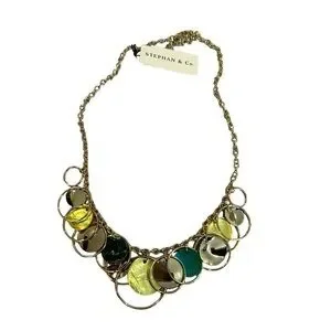 This Stephan & Co. NWT gold tone circular gold metal loops and shells that colors include a green , dark teal green, yellow gold, and tan. It has a lobster claw closure. Chain length is at longest length is 8 1/2” 😊