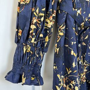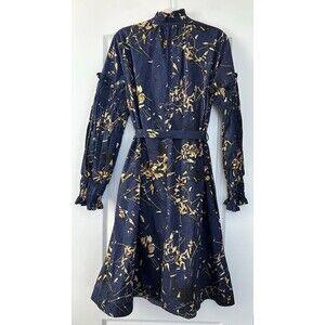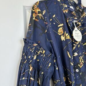 Anthropologie Hope For Flowers Tracy Reese Shirt Dress Full Sleeve Abstract Sz L Navy Blue Yellow Abstract Belted Ruffle Sleeve Button Down.