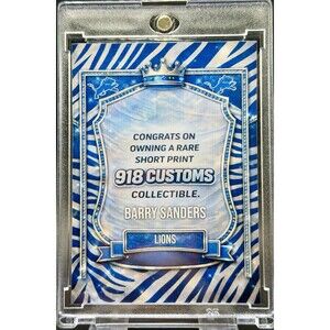 The product is a unique trading card featuring football legend Barry Sanders in a 1/5 SP Zebra Holographic design. This limited edition card is part of the National Football League (NFL) collection and showcases the Detroit Lions player in a special holographic variety. Manufactured in 2025, this sports trading card is a rare and collectible item for fans of football and the iconic Barry Sanders.
